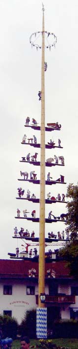 In Bernau am Chiemsee wurde der Maibaum gestohlen. Seit Januar lagert er unter dem Dach eines Bauernhauses im Nachbardorf. Der 27 Meter lange "Riese" ragt von der Haustür durch den Flur bis in den Stall. Doch am 1. Mai wird er auf ein Pferdegespann gehievt, das ihn unter dem Jubel von Mädchen und Burschen in Tracht zurück nach Bernau zieht. Für eine Brotzeit und einen symbolischen Geldbetrag kaufen die Bernauer ihren Maibaum zurück und stellen ihn wie in alten Zeitenin der Dorfmitte auf ohne technische Hilfsmittel, allein mit männlicher Muskelkraft. |